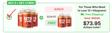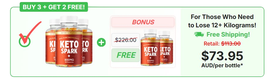 The initial value on the official website is $565.00 for a 5-bottle (Buy 3 Get 2 Free) package of KETO SPARK, but with the special offer, the same package costs $369.75 , paying only $73.95 per bottle. In addition, they include Free Shipping in AU at no extra cost — which I particularly loved!